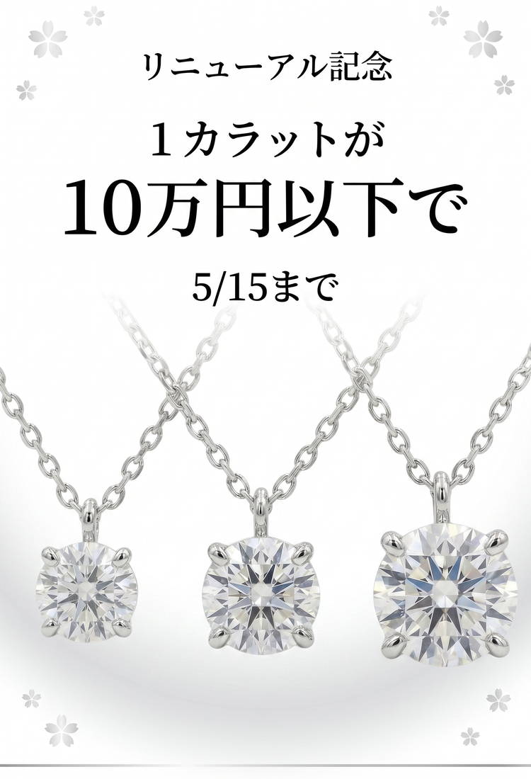 ご予算はお客様に応じて。シンプルな1カラットのネックレスは10万円から。2カラットのリングは、30万円程度です。