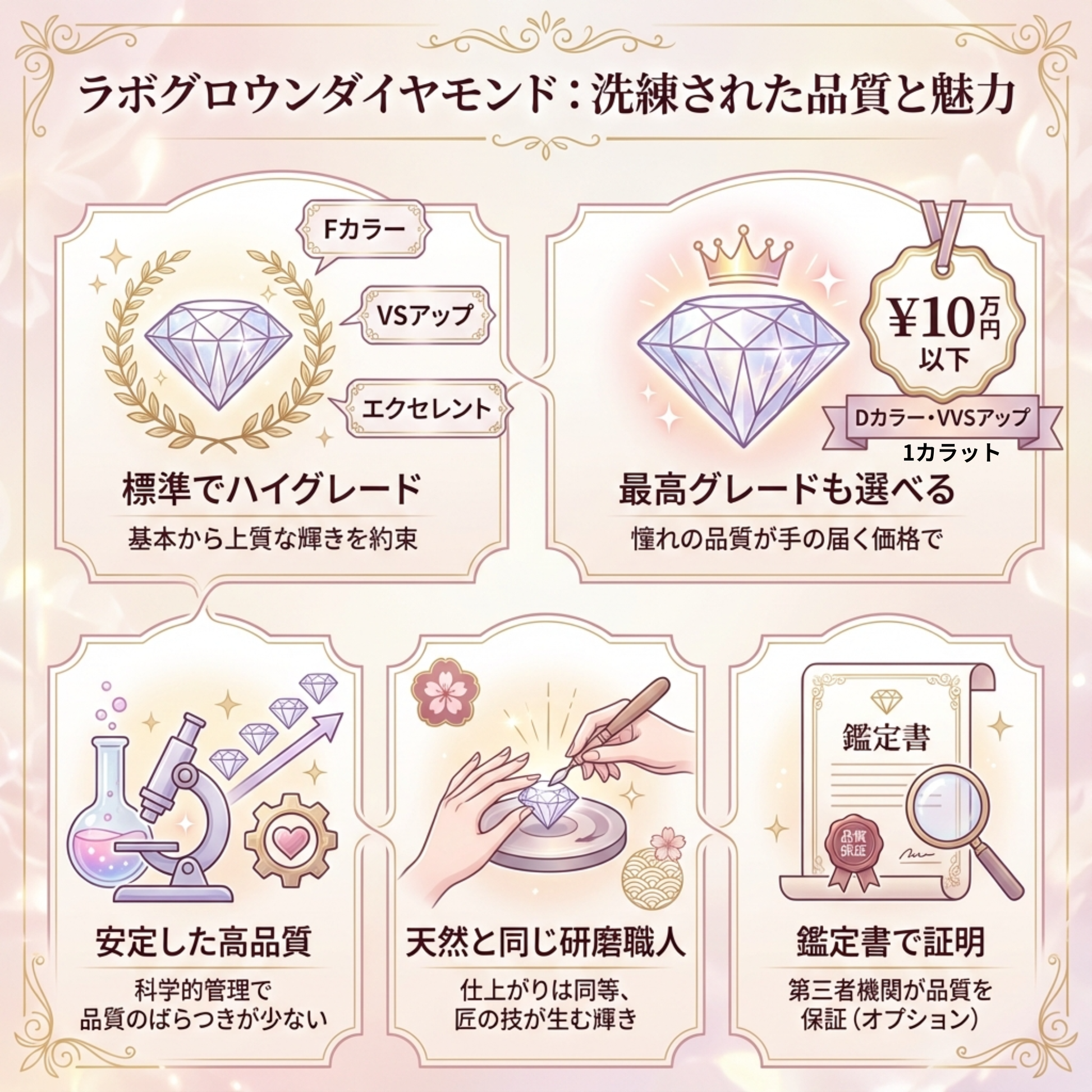 ラボグロウンダイヤモンドならではの澄んだ輝きと、上質な存在感をお楽しみいただけます。